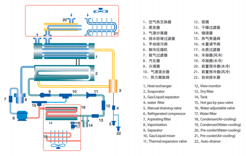 壓縮空氣經過預冷卻器(20、21)、回熱器(1)和蒸發器(2)逐步冷卻后,空氣中水汽凝結成液態水珠,經氣液分離器(3)分離出液態水。經過氣液分離器(3)的干燥冷卻空氣通過氣對氣熱交換器(回熱器) (1) 的另一流程,在離開干燥機時被升溫。