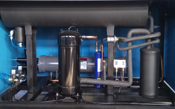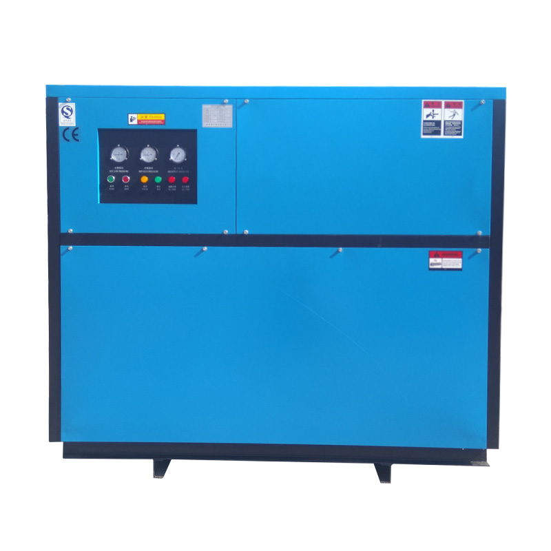 制冷系統的冷凝器采用冷卻水方式冷卻。主要用于供水條件較好、進氣溫度較高及空氣處理亮較大的場合,因其受環境溫度因素影響小,所以出口空氣露點較穩定,主要適合對用氣露點要求穩定,環境溫度高的用戶。壓縮空氣進入空氣預冷器預冷并除去部分水份,再進入空氣冷卻器使溫度降至2℃(露點溫度),空氣中的水份在此溫度下析出,經氣水分離器分離并由自動排水閥將水份排出,而干燥的低溫空氣則進入空氣預冷器,再與未處理的壓縮空氣進行熱交換升溫后輸出,即為處理后的干燥空氣。